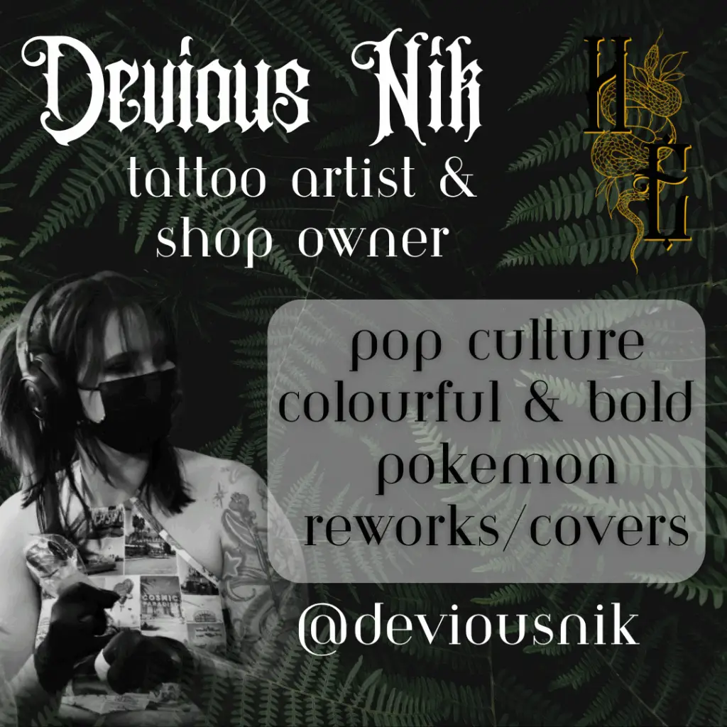 Nik is the owner of House of Eve Tattoos. She has been tattooing since March 2021 and is our colorful pop culture artist. She also enjoy reworks, glow-ups and cover up tattoos. Her favorite part of being a tattoo artist is learning from and meeting other artists.