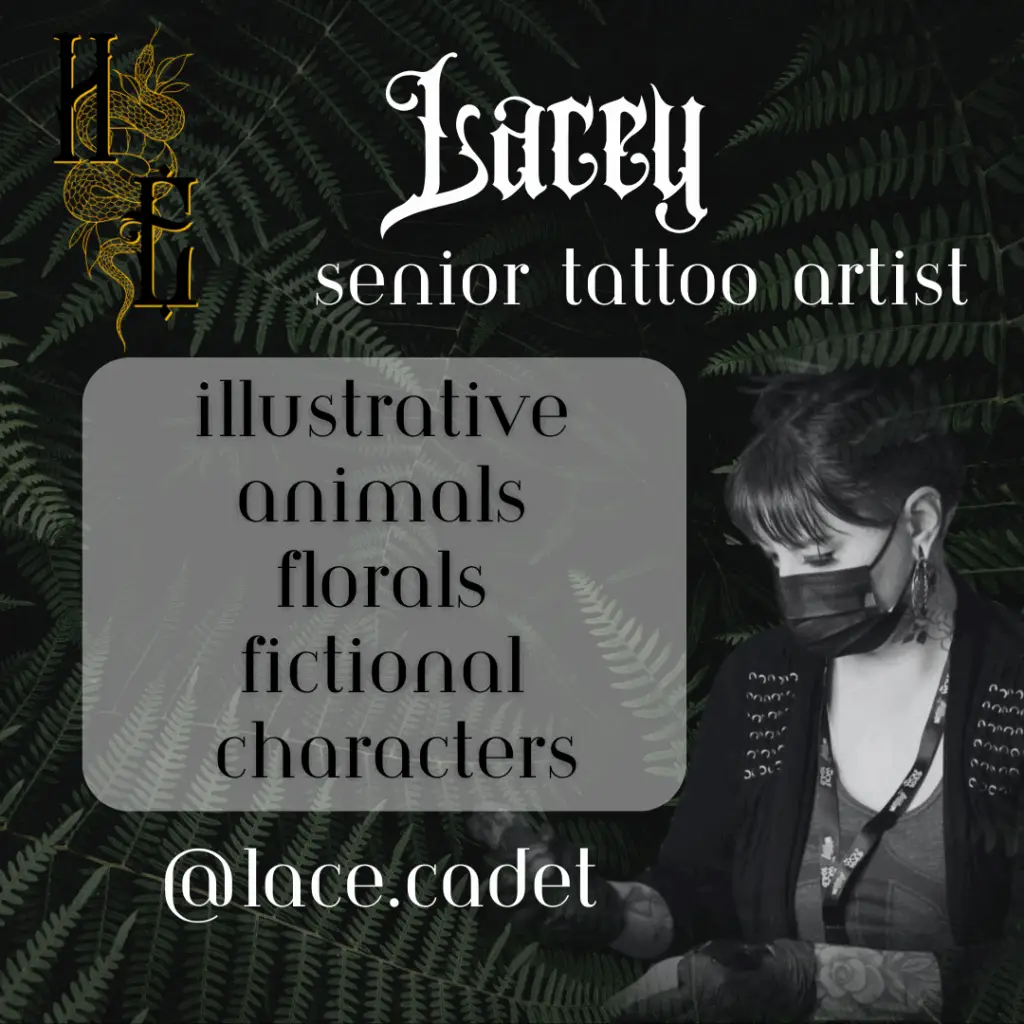 Lacey is one of our fabulous senior artists! She specializes in illustrative black and grey, crisp lines and precise detail.